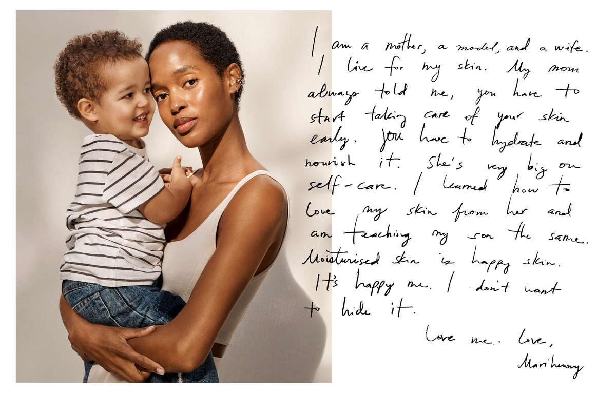 My mom always told me, you have to start taking care of your skin early. You have to hydrate and nourish it. She’s very big on self-care. I learned how to love my skin from her and am teaching my son the same. Moisturised skin is happy skin. It’s happy me. I don’t want to hide it.